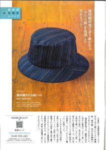 雑誌『週刊新潮』2024年5月30日号(2024年5月23日発売)の、連載「優越感具現化カタログ」で、やたらの播州織やたら縞ハットが掲載されました。世界中から選りすぐった逸品を紹介する連載で、「播州織産地では、織物が売れに売れた戦後の「ガチャ萬」と言われた時代、糸不足から様々な残糸で織った「やたら縞」と呼ばれる織物があった。」「それを現代の技術・糸使いで復刻し作った折り畳みできるハット」として紹介されています。『週刊新潮』は、1956年(昭和31年)2月に、出版社が出す初めての週刊誌として創刊された、高い人気を誇る総合情報誌です。